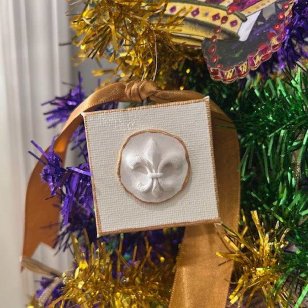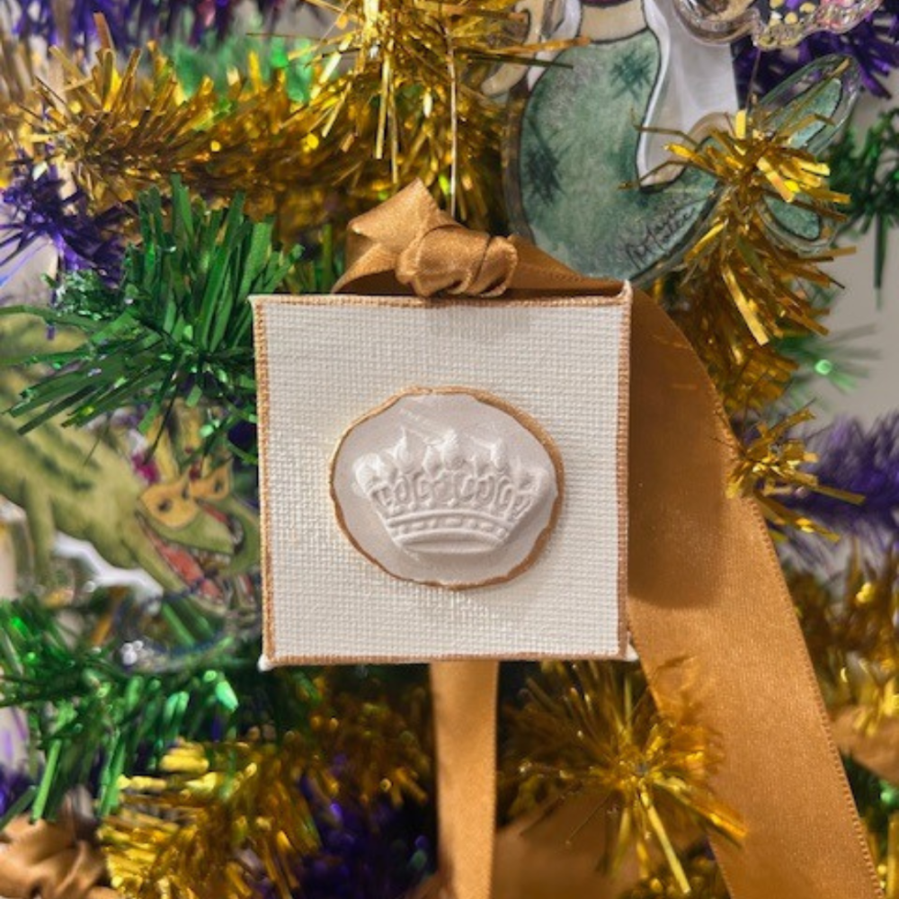 Mardi Gras Intaglio on 2X2' Canvas Adorned with a gold ribbonPerfect to add to a wine bottle for the festive host!
